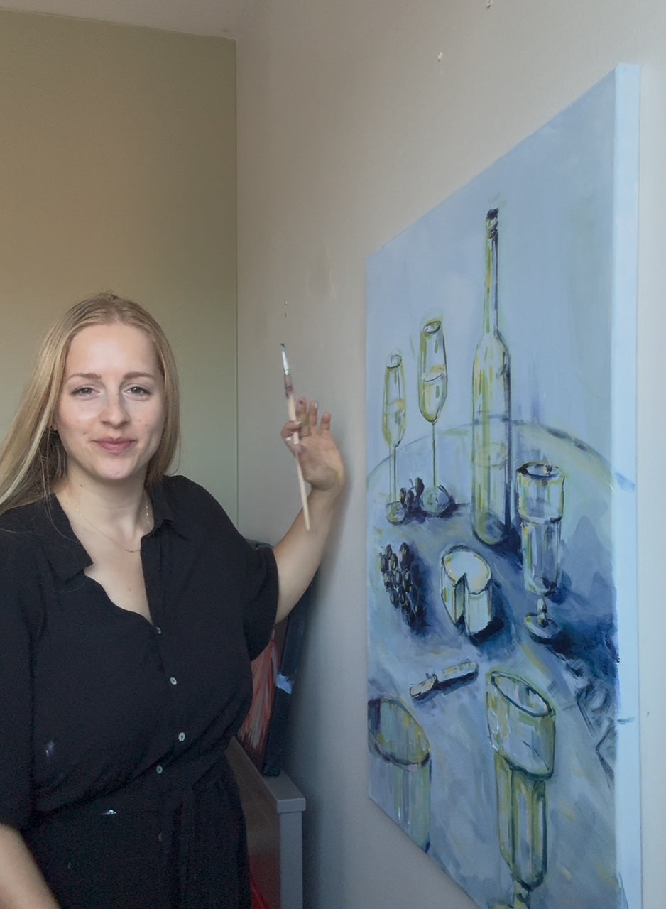She holds formal training from the Academy of Fine Arts and Aalto University in Finland, where she developed her interest in expressive mark-making, color relationships, and material exploration.