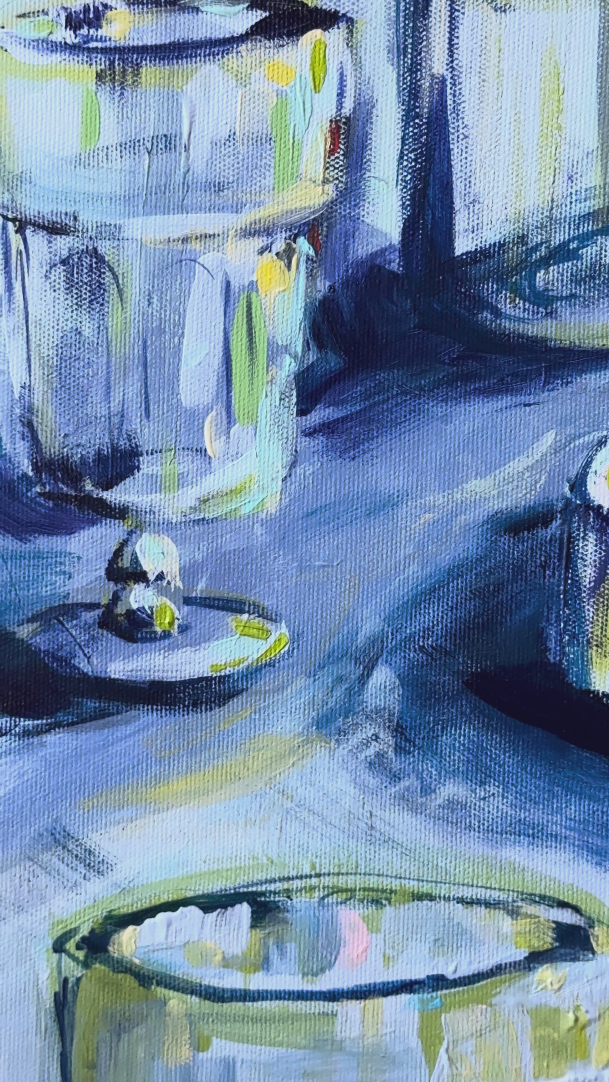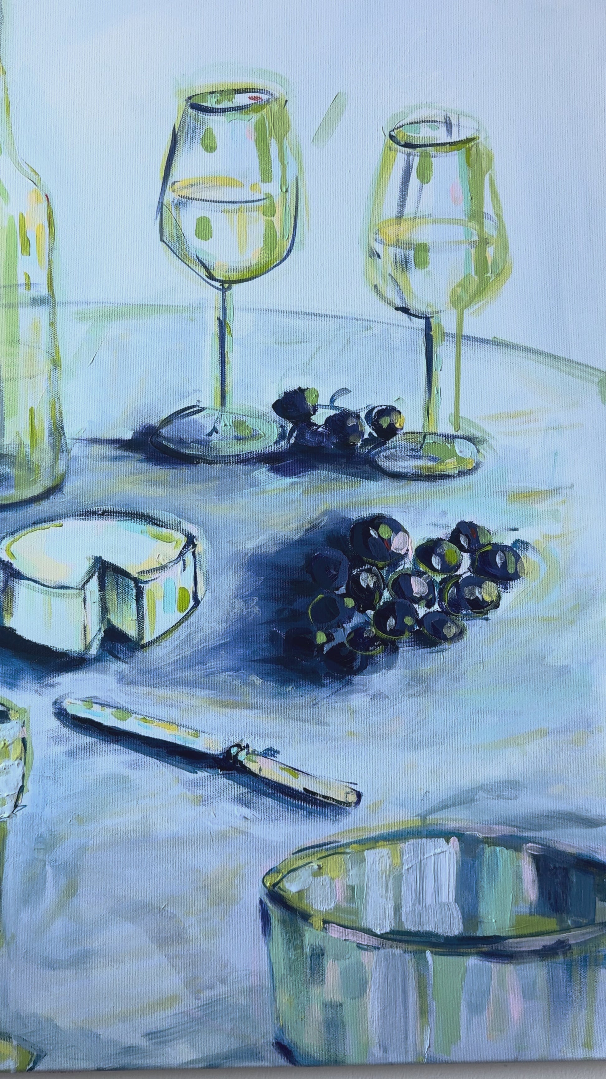 Cool, reflective tones give this piece a sense of quiet intimacy. A wine bottle, glasses, cheese, and grapes sit suspended in soft blue light, their outlines shimmering with hints of green and yellow. This still life feels like a memory of an evening shared - a fleeting moment of calm and connection captured in paint.